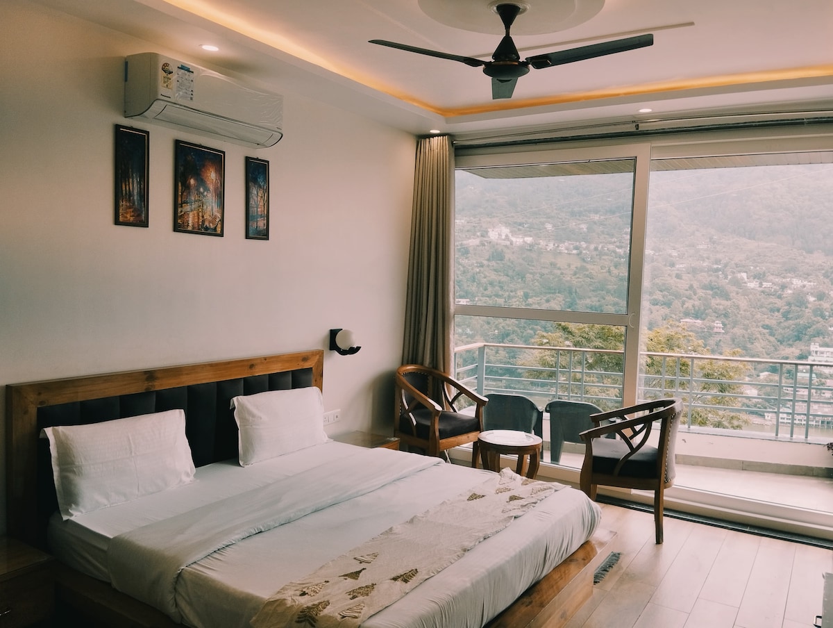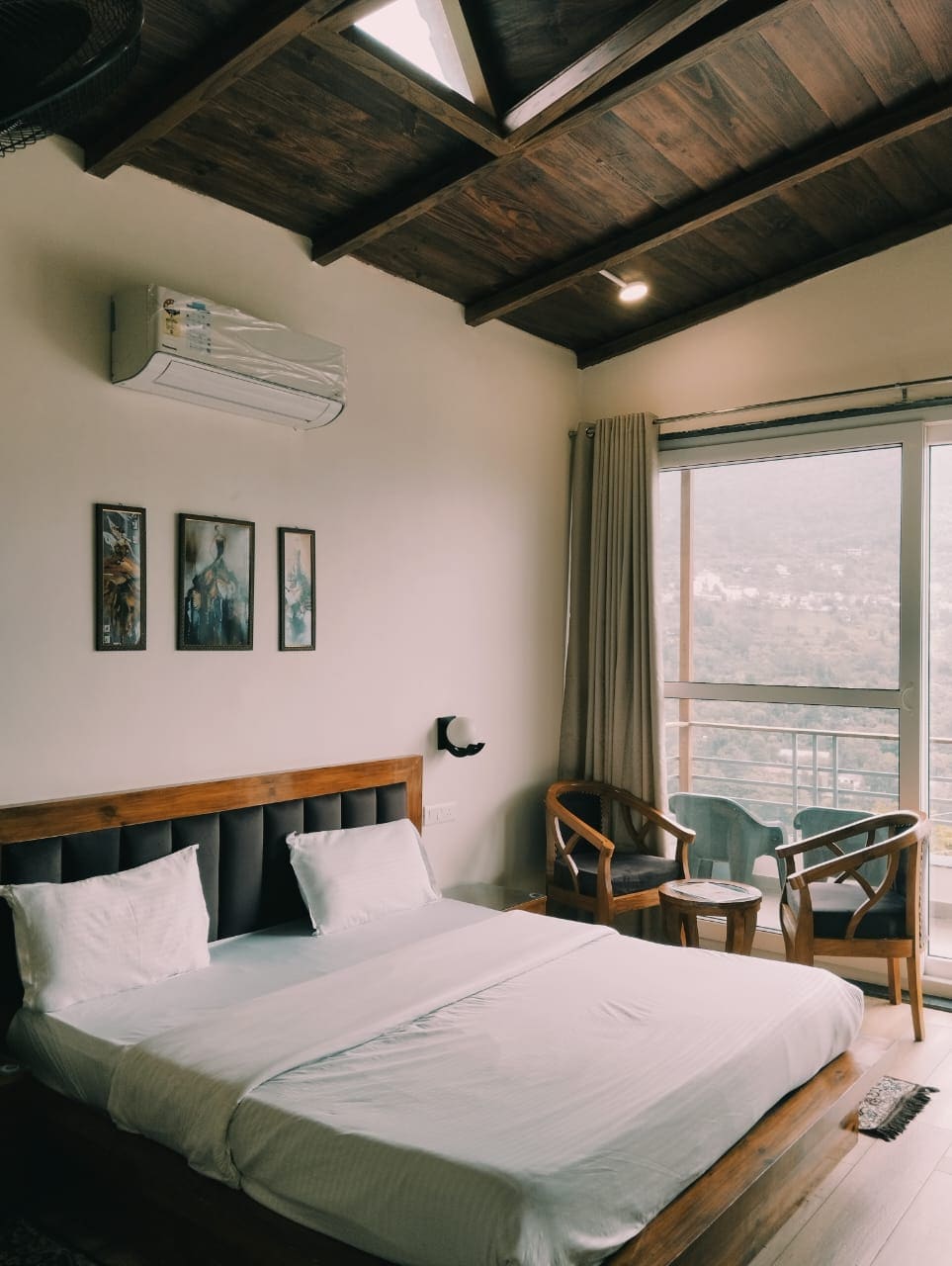 Combined Rooms with a private kitchen and a PRIVATE TERRACE. This Family deluxe room offers a serene forest view, perfect for families or a group of friends seeking a peaceful stay. With ample space, it comfortably accommodates a family of four, featuring a king-size bed, a private kitchen, a living area with dining facilities, a sofa, and a private terrace. Both rooms are attached to Private washroom each for convenience. Guest are allowed to cook their own Food and your breakfast is on us!