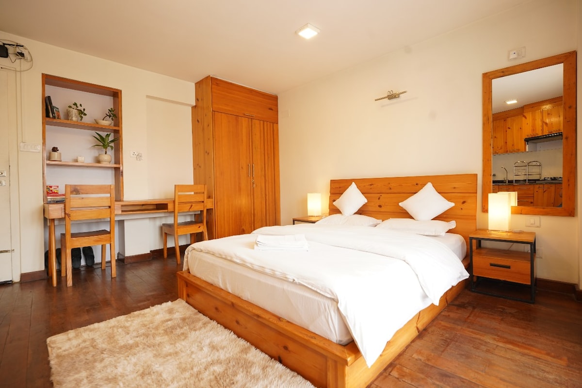 Escape to a stylish, European-inspired studio on the top floor in central Kathmandu. This private and quiet retreat is perfect for solo travellers, couples, or remote workers, comfortably fitting two guests. Enjoy a king bed, dedicated workspace with ultra-fast Wi-Fi, and a shared rooftop terrace with BBQ. All this is just a 12-minute walk from the vibrant Thamel district, offering a serene base for exploring the city.