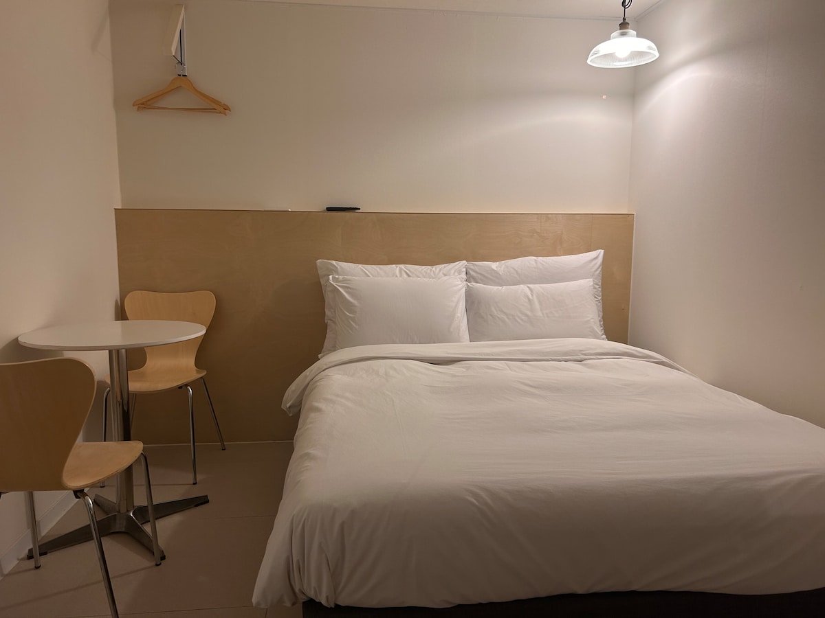 <모던한 스타일의 원베드룸> -디지털도어락 -미니 냉장고 세팅 -객실 내 취식가능 -개인 화장실 -에어컨 & 바닥난방 -티비시청가능 -헤어드라이기,고데기,화장솜,면봉,샴푸,샤워젤,수건