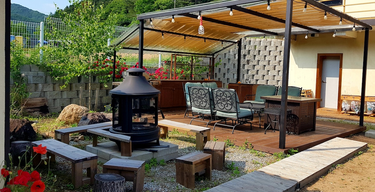 산멍, 하늘멍, 별멍, 불멍... 아무것도 하지 않고 멍하니 있어도 충분한 곳. 공해와 소음 없는 곳에서 맑은 공기, 탁트인 경치 만끽하실 분을 하루에 한팀만 모십니다. 여름엔 유기농 채소, 겨울엔 원적외선 나오는 친환경 구들방을 체험할 수 있고, 욕실 딸린 원룸과 함께 뒷마당 파티오를 단독으로 사용합니다. - 바베큐 비용은 2만원이며 소금, 후추, 바베큐 도구를 제공합니다. 불멍 공간 사용은 무료이고, 이용 후 깨끗이 정리해 주세요(장작은 사 오세요). - 이곳은 해발 700m로 기온이 평지보다 낮으므로 따뜻한 외투 꼭 챙겨오세요. - 자연속 공간이므로 내외부에 곤충이 보일 수 있습니다. 예약시 참고하세요. - 폭설이 올 땐 2륜 승용차는 올라오지 못할 수 있습니다. 그럴 땐 저희 차로 이동 도와드립니다.