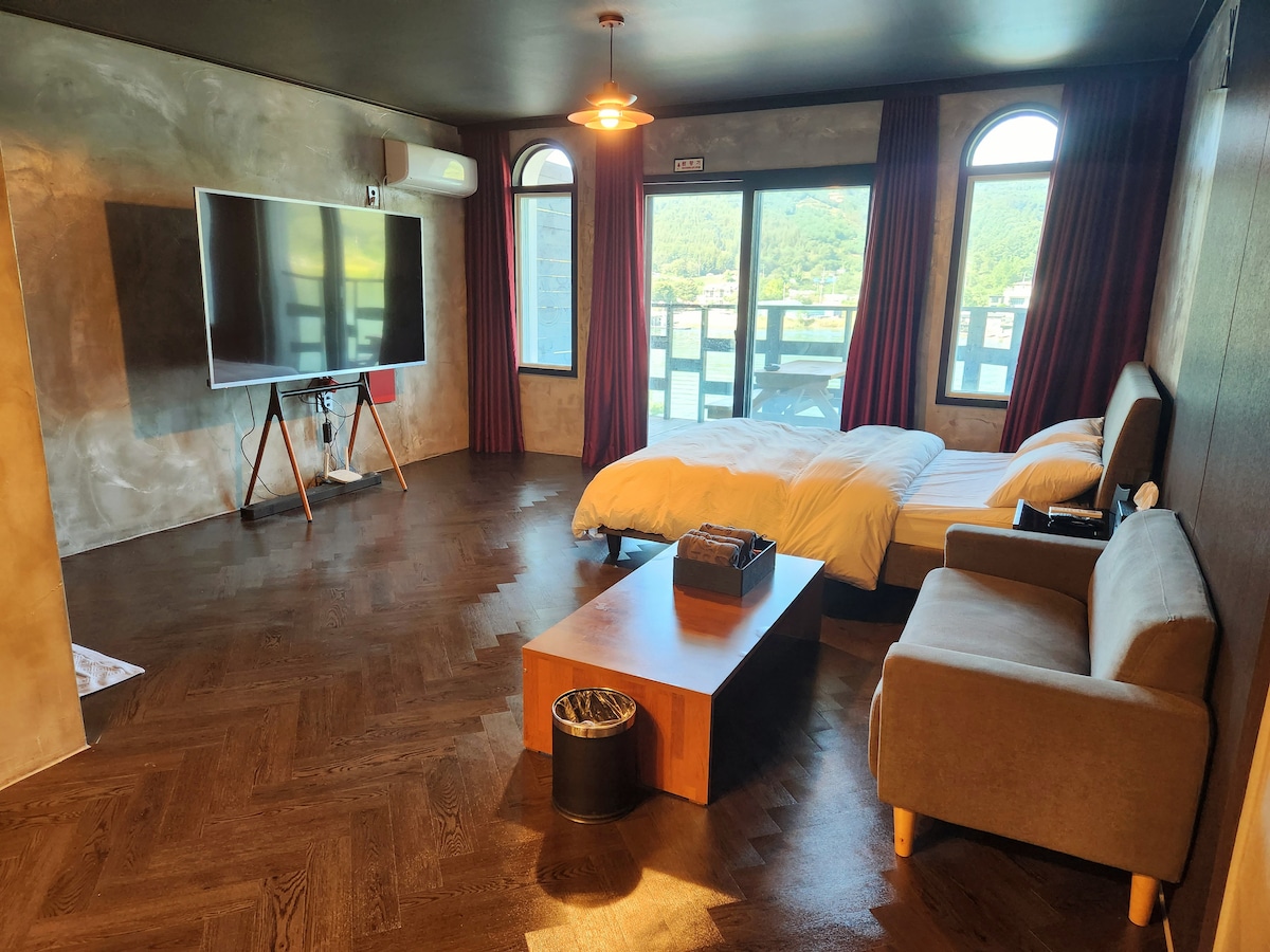 서핑의 성지 죽도에 접하여 있는 바다! 도보로 30초, 침대에 누워 커튼을 걷으면 파도소리와 일출 감상, 테라스에서 커피와 파도의 눈부신 반짝임을 느껴보세요. 잔잔한 파도와 상쾌한 바닷바람이 펼쳐지는 매혹적인 해변의 안식처를 만끽해 보세요. 평화로운 숙소로 침대에 앉아 커튼만 제쳐 바라보는 자연 그대로의 해안선은 타의 추종을 불허하는 전망을 자랑하며, 로비에서 불과 몇 걸음 거리에 있는 햇살가득한 해변으로 바로 연결됩니다. 평온함을 찾으시는 분들은 휴식을 염두에 두고 준비된 이 곳 모카 객실에서 행복한 휴가를 경험해 보세요. 그동안 자신만의 길을, 자신만의 보폭으로 한걸음 한걸음 의연하게 걷고 있는 당신 !!! 이곳에서 함께하신 이후 찰랑이는 파도같은 변화와 오션의 눈부심같은 내일을 맞이할 수 있는 심플하고 세련된 객실입니다.
