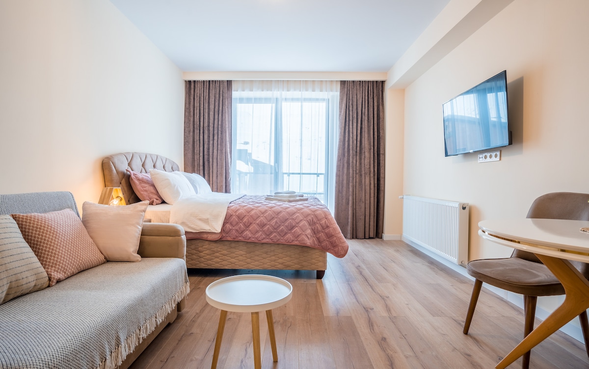 Welcome to this bright and cozy studio apartment, perfectly situated in New Gudauri. Quit location, free private parking and the same time very close to everything ( supermarket, pharmacy, cafes, bars and the best skiing courses ). The apartment offers a harmonious blend of modern comfort and a warm atmosphere. With a comfortable bed, a snug sofa, a well-equipped kitchen and a modern bathroom it has everything what you need to relax and recharge.