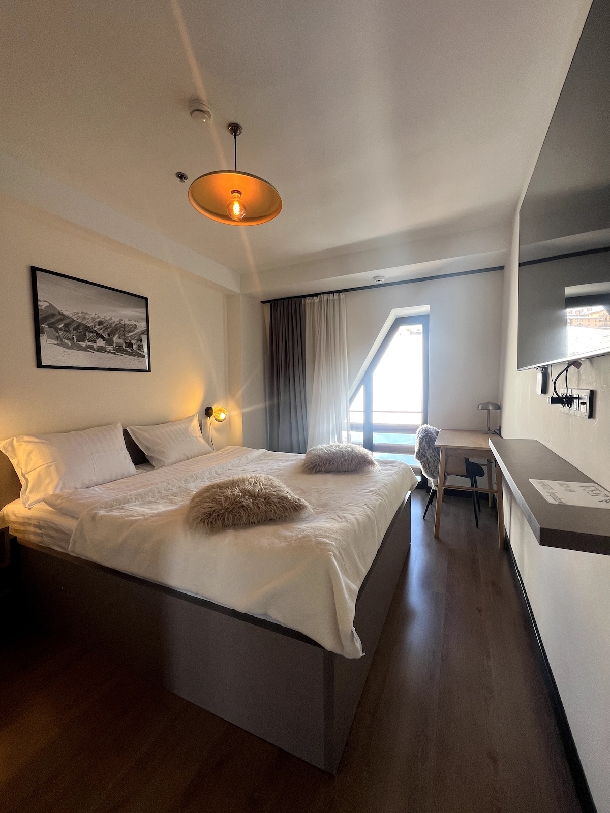 Beautiful chalet atmosphere apartment with panoramic mountain view located in the heart of New Gudauri Ski Resort 2300 m above the sea, in the TWINS Residence. Minimalist design, natural textures and epic view. Enjoy the epic view of the valley of Gudauri and ski run, as well as breathtaking sunsets while taking a hot bath. Mountain streams, the ever-changing sky, herds of livestock with shepherds and unforgettable thunderstorms at night in the summer. Popular Kazbegi is 40 minutes drive away.