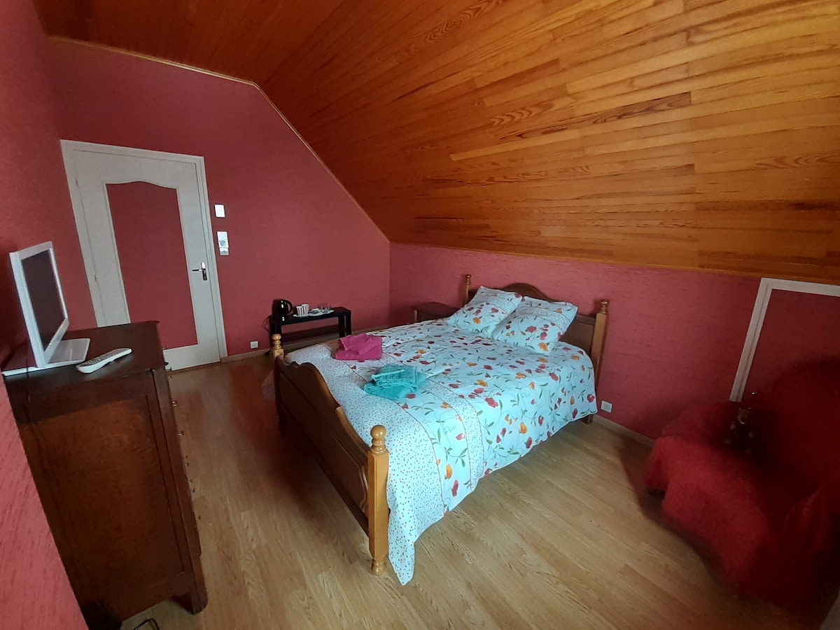 Chambre spacieuse et chaleureuse en bois et parquet de 18 m2 avec un lit Queen Size, dunlopillo. Vous disposez d'une salle d'eau privative et de toilettes individuelles; chauffage central, double vitrage, connexion Wifi, TV 100 cm. Cintres et étagères. La literie, les serviettes et les articles de toilette sont fournis. Petits déjeuners inclus ( boisson chaudes, pain frais, beurre, confitures, fruits, yaourt, jus de fruits, friandises ).