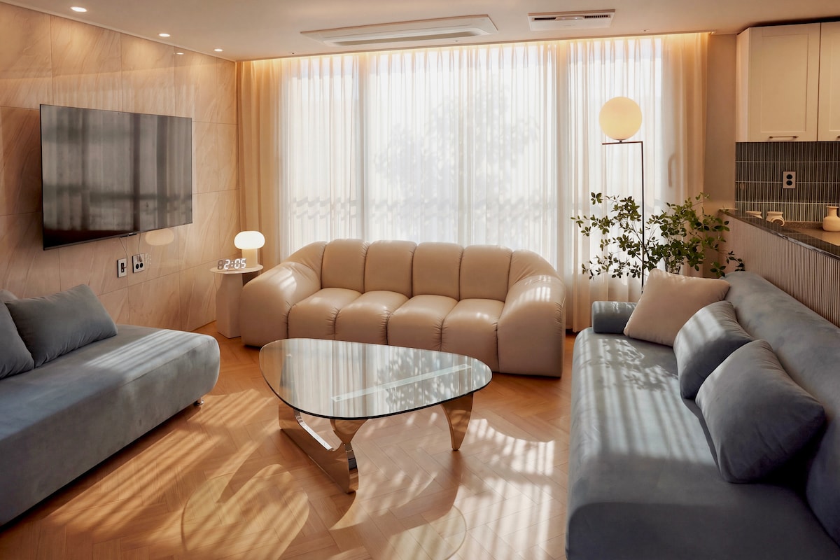 Neurujae – a 4F private stay at the end of a quiet lane near the park. Calm retreat in the city, ideal for family trips, hospital visits, concerts or running. 🏃 5 min to Ogeum Park, 20 min to Olympic Park – loved by joggers & walkers. 📍 5–7 min walk to Ogeum/Bangi stations, 4 min to Airport Bus 6300. 10 min drive to Jamsil 🛏 2 bedrooms (Queen + Super Single each, sleeps 6). Extra topper for 7–8 guests. 🚫 4F walk-up, no elevator. Contact host if carrying heavy luggage.