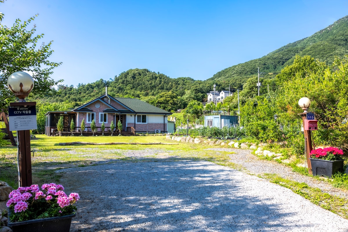 We have spacious Garden with lovely pine trees and seasonal flowers. You can feel healing and relax with our lovely calm garden. We have also small farm growing ingredient fruits. you can pick & enjoy eating for breakfast in summer season. You can take a walk along the riverside path near our house and enjoy water skiing and paragliding. Public transportation is also available. It's a 10 - minute walk from Asin Station on the Gyeongui-Jungang Line. Pick-up from Asin Station is also available.