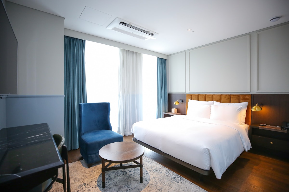 초고층뷰에 낭만적인 야경을 더하다 반짝이는 야경에 로맨틱한 시티뷰 시원하게 탁트인 자연 전망의 파노라마 경관 마운틴뷰 편리한 교통과 전통시장을 함께 경험할 수 있는 최적의 위치 효율적이고 여유로운 공간 구성으로 마음편히 누리는 안락한 휴식 눈부신 햇살이 내리쬐는 채광의 침실 포근한 유럽식 호텔 침구, 푹신한 휴식을 즐길 수 있는 침대 밝은 색감의 조명 배치와 모던한 우디 인테리어 마음에 스며드는 편안한 힐링,에너지 충전, 만족스러운 호캉스를 즐겨보세요!