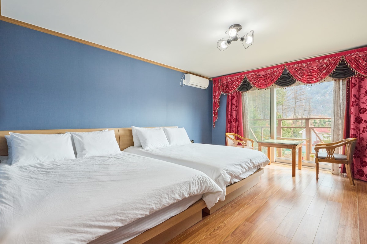 Nestled in the lush hills of Gapyeong, our newly renovated 2 bedroom guest suite provides a tranquil escape for city dwellers and international travelers alike. Large panoramic floor-to-ceiling windows provide plenty of natural light and stellar views of the surrounding hills. The indoor wood-burning fireplace creates a cozy atmosphere as you relax or prepare a meal in the kitchenette. Two spacious bedrooms feature queen sized beds to accommodate four guests (two additional guests possible).
