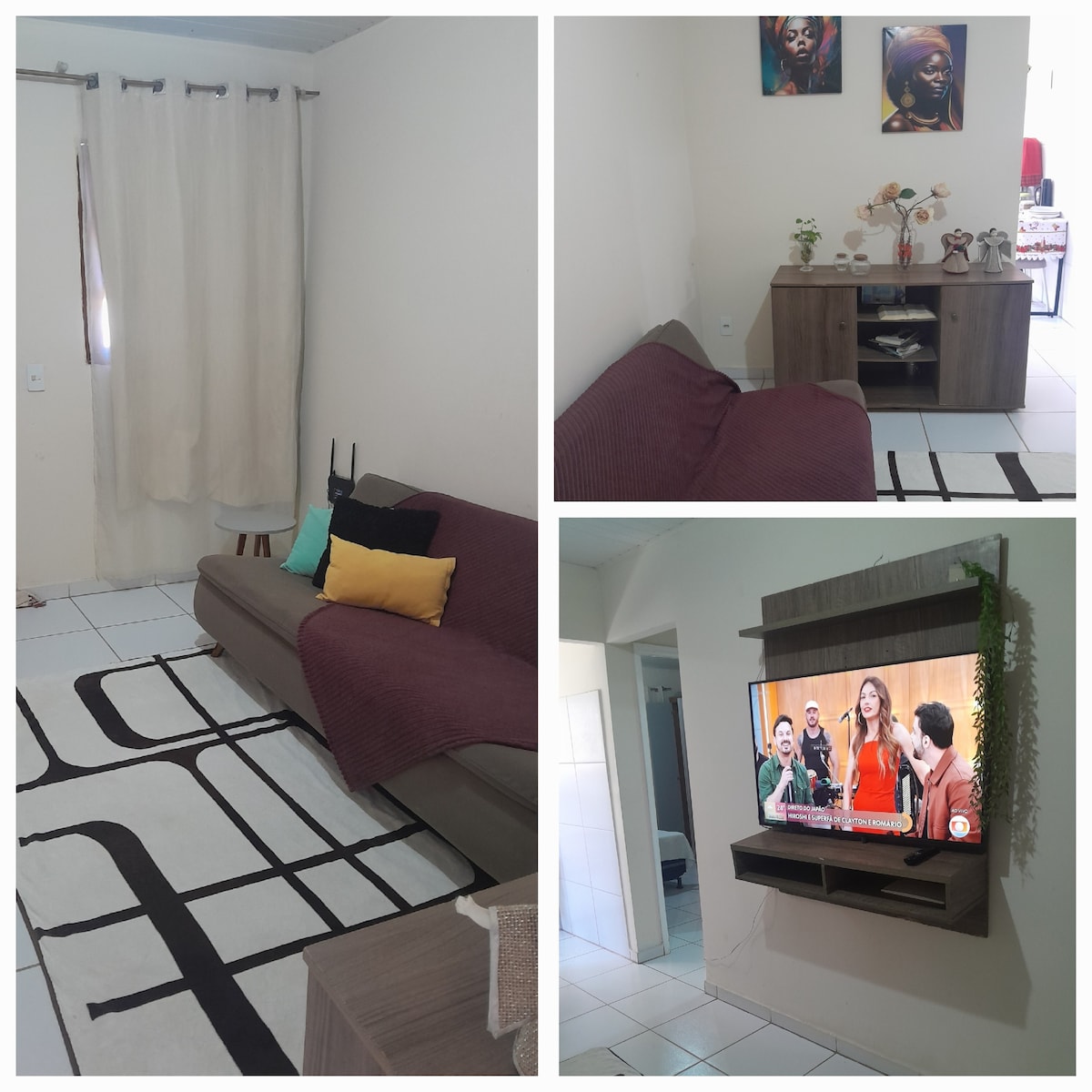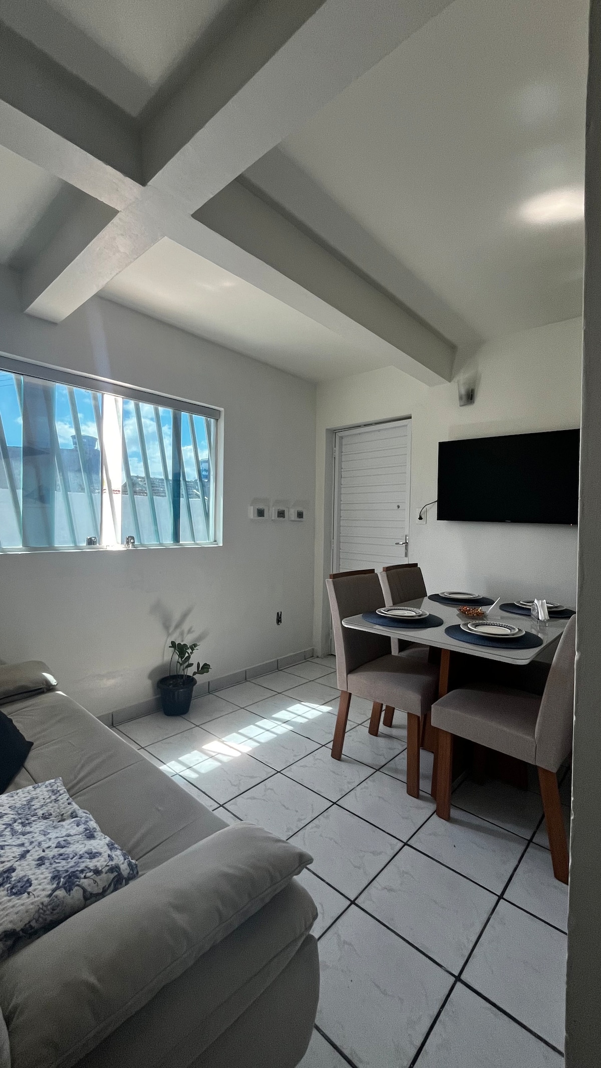 Ar condicionado quente/frio nos 02 quartos, sendo 01 suíte. Wi-fi. Portaria 24h. Rede de proteção nas janelas. Aceita pet pequeno. Informar na reserva A 3min do centro e FIG (de carro). Roupa de cama e travesseiros. Toalhas de banho. Ferro de passar Chapinha cabelo 01 vaga em Garagem. Segundo Andar em Condomínio Fechado, próx de padaria, mercado, farmácia… Sala de TV com Sofá cama e Vídeo Game Retrô, brinquedos infantis. Água e luz incluídos.