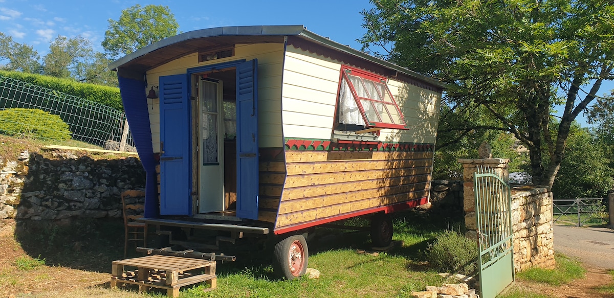 Nous mettons à la location notre véritable roulotte tzigane familiale au cœur d'un village caussenard recherché tout proche des gorges du Tarn. Dépaysement, déconnection et tranquillité assurés. Située sur le terrain de la maison du propriétaire , à l'écart, en toute intimité. Lit 140X190 très confortable , réfrigérateur, douche et toilettes sèches sous abris à l'extérieur. Possibilité de location de linge de nuit et serviettes. Petit déjeuner possible également. Location à la nuitée.