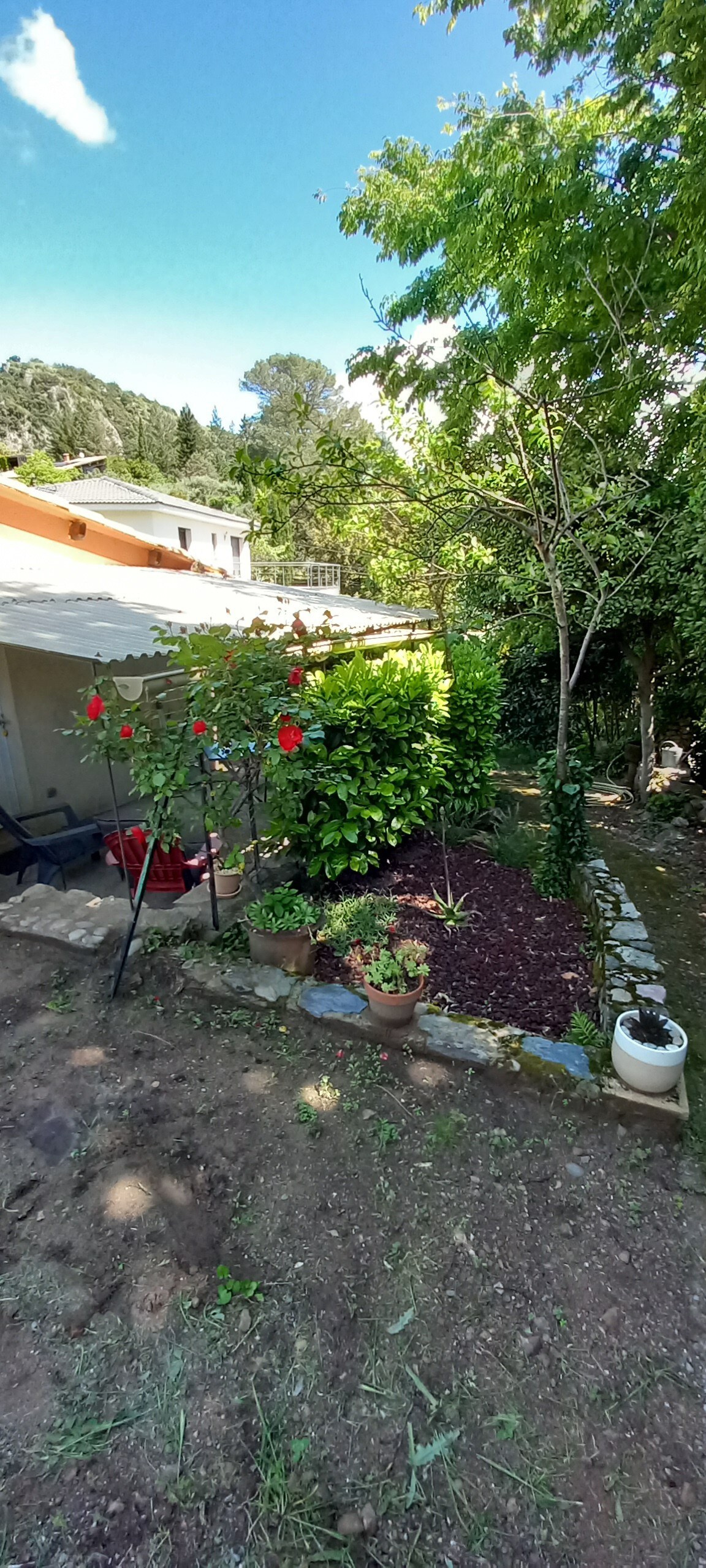In the southern Cévennes, 1 hour from Montpellier Optional jacuzzi (35°C), please reserve 24 hours in advance. Minimum 2-day use: €55, 3 days €65, etc. Water changed weekly. All-wood living space adjoining the vegetable garden, comfortable for your relaxation, with two queen-size beds (160cm), one single bed (one on a mezzanine), and a baby cot. Kitchen, bathroom, and toilet. Shaded Terrace in Sumer, full sun in Winter. Meals available upon request (set menu). Reduced weekly