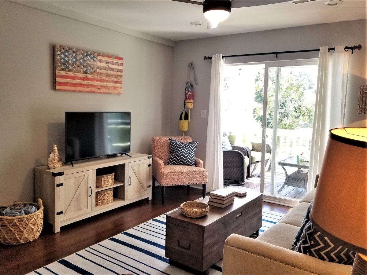 Sunnyside Inlet Cottage is a 300 sq ft guest home that is **DOG FRIENDLY** The cottage has a full bathroom, comfy King bed and loveseat. The kitchen has an apt size fridge/freezer, stove, oven, Keurig and microwave. The kitchen is stocked with pots and pans, plates, bowls, silverware and cooking utensils. Staying in? Enjoy the 50 inch smart roku tv with YouTube TV access, and WiFi. The deck has a table, umbrella and two chairs.