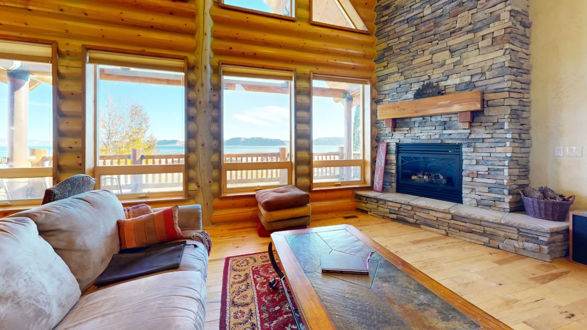 Stunning Bear Lake Retreat with panoramic lake views from a 66-ft porch! Perfect for gathering family's and friends, enjoy a huge Smart TV, games, workspace, laundry & fast WiFi. Minutes to the beach, marina, restaurants & shops. The perfect Bear Lake getaway for relaxation and adventure! Close to the lake + a 66 Foot porch to relax and take in the stunning Bear Lake views [Huge TV + Games + Workspace + Views + Laundry]