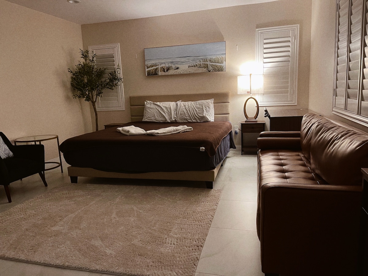 Tustin Hideaway is on a beautiful property in a quiet upscale neighborhood! Very new built Dec 2021! Space offers a comfy bedroom, a spacious bathroom, and a mini kitchen with a fridge, microwave. Minutes from the 5/55/91 freeway and all the great amenities that Orange County has to offer! Only 10 miles away from Disneyland and AngelStadium.Hond Ctr.Only 20 mins to Newport. Laguna and OC Airport.Only one pet allowed but will consider more with sm increase $..depending on length of stay.AskMe!!