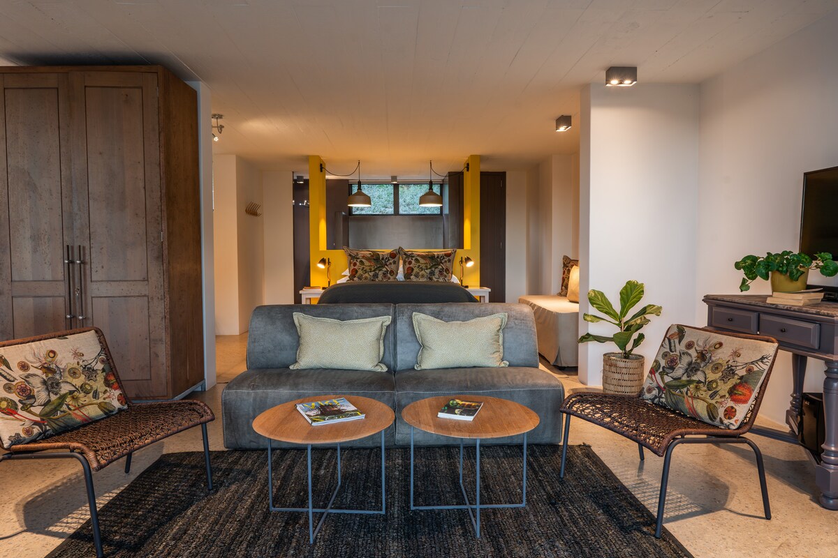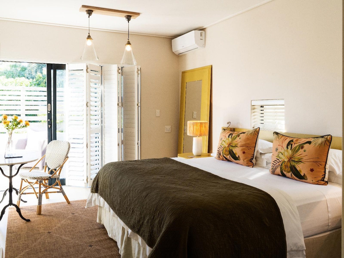 This luxury self-catering apartment consists of a lounge, kitchen and ensuite bedroom that sleeps 2 adults. Two corner windows showcase the gorgeous views of Buffalo Bay, the famous Knysna Lagoon and the Outinique mountains. The corner chaise is ideal for reading a book whilst taking in the unbelievable views. The Protea Room has direct access to the Fynbos gardens, sunset viewing deck and firepit boma, each with their own iconic vistas. The apartment is accessed via one flight of stairs.
