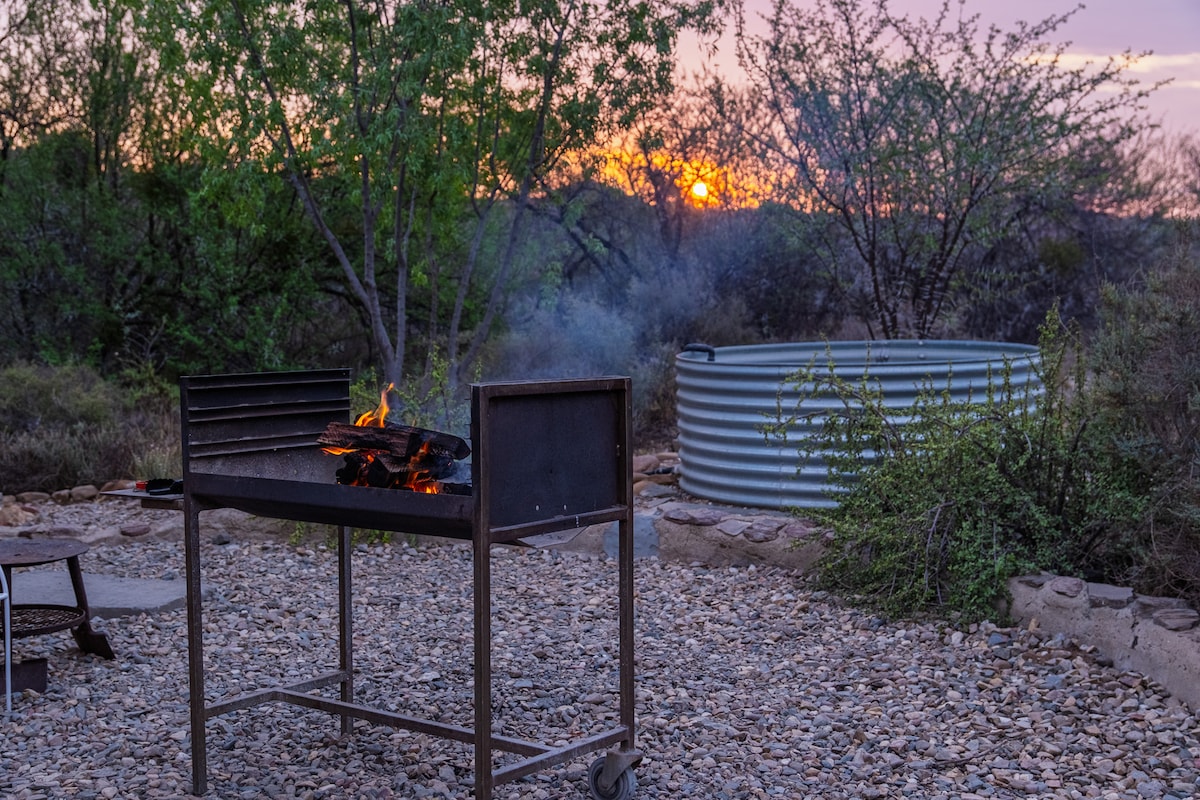 Red Rock is a secluded and beautifully updated cottage — perfect for couples who love quiet nature, long mornings, and cozy evenings. With a brand-new kitchen and two charming bedrooms, you’ll have space to breathe — whether you're two people or a small family. The open plan living area opens up to cosy patio with plunge pool, braai facilities, patio furniture and outdoor lounge area and uninterrupted views of the Klein Karoo Landscape. Limited free WiFi available.