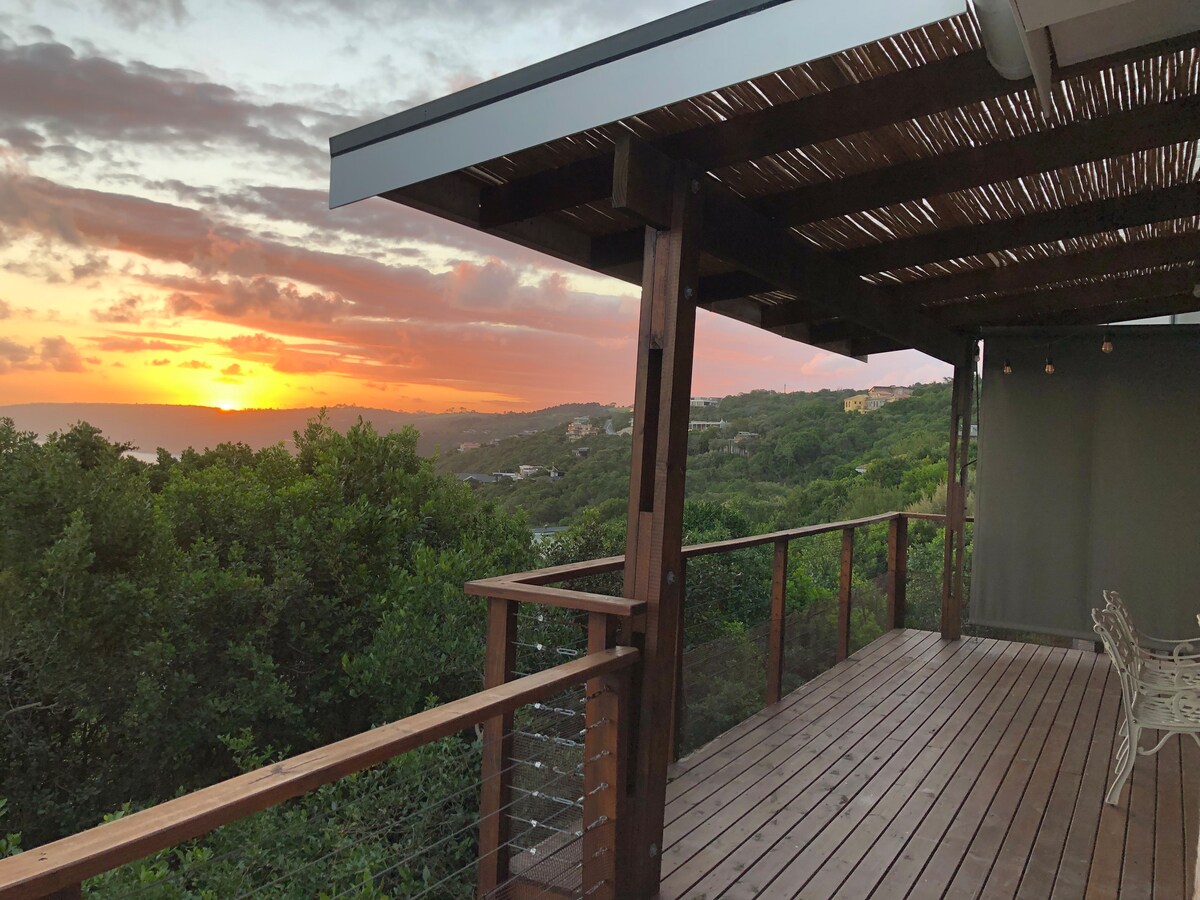 Entire private studio for 2 with Valley & Forest views. Quiet Knysna cul-de-sac. Wake to birdsong, coffee on the deck, then hit trails, lagoon and town (5 min drive; Uber available). Self-cater easily: full fridge/freezer, gas stove, microwave with built-in oven. Fast Wi-Fi + workspace. Charcoal BBQ. Pet-friendly (no large dogs). Rustic, handcrafted cabin finishes - safe, cosy, tranquil.