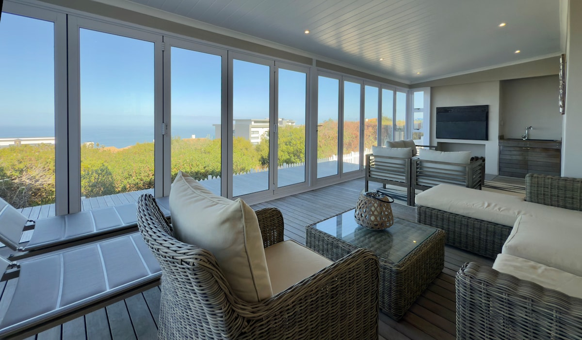 Inverter/Battery backup power supply. 4.4m x 2.4m heated pool. The house is set in a dramatic location perched 60m above the ocean, with endless ocean views. Set in a 94 hectare private , safe reserve, walks and hikes from the front door, come and experience nature in luxury. Whales/Dolphins/wildlife/ stars! 24 hour security 15 minutes to George Mall, 20km from George Airport. The house has 180 degree views over the Ocean, with fresh clean air and the sound of the ocean below.