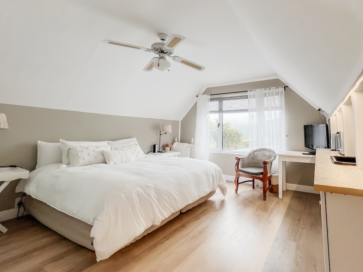 Tucked away in tranquil private garden, this charming hideaway invites you to slow down and unwind. Sink into a queen-size bed dressed in crisp white linen, enjoy the comfort of an en-suite shower, make yourself at home with a cozy kitchenette featuring a microwave, bar fridge, and Nespresso coffee machine. Fast Wi-Fi, peaceful surroundings, and a romantic atmosphere await. A hot tub is available on request at R500 per session, and the sauna at R150 per person — perfect for relaxing together.