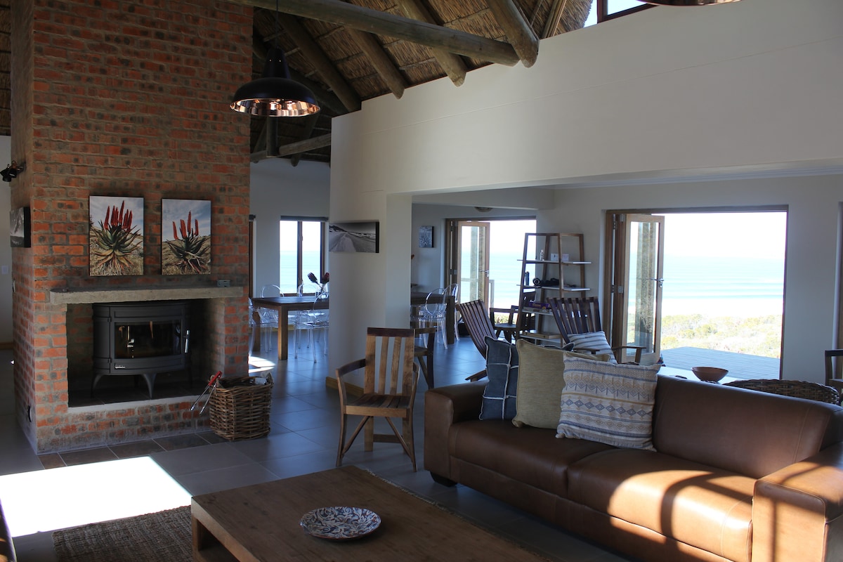 Backup power supply. 4.4m x 2.4m heated pool. The house is set in a dramatic location perched 60m above the ocean, with endless ocean views. Set in a 94 hectare private , safe reserve, walks and hikes from the front door, come and experience nature in luxury. Whales/Dolphins/wildlife/ stars! 24 hour security 15 minutes to George Mall, 20km from George Airport. The house has 180 degree views over the Ocean, with fresh clean air and the sound of the ocean below.