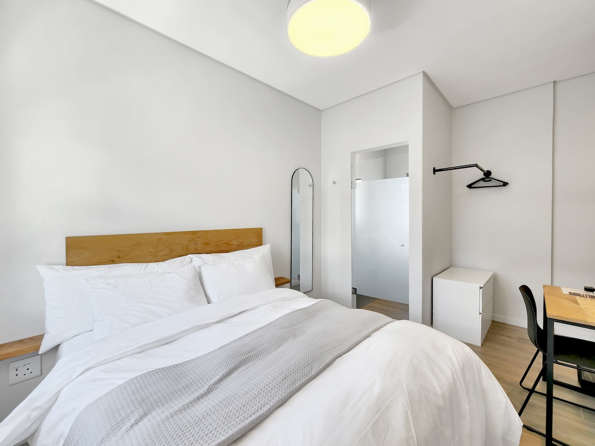 Bright and minimal Standard Double Room with a double bed, private bathroom with shower and amenities, fast WiFi, smart TV, and a small work desk. Enjoy city and mountain views, daily housekeeping with fresh linen, and access to our shared kitchen. Perfect for couples or business travellers wanting comfort, convenience, and reliable security with night staff on premise. Great value in a central location in District Six.