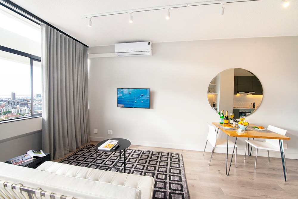 Luxury, contemporary, and comfortable air conditioned studio apartment with magnificent views over the city and Table Bay Harbour. Conveniently situated above the upmarket Gardens Shopping Centre offering guests 24/7 security. Close to all tourist attractions and with easy access to public transport. This apartment is a must for guests looking to experience Cape Town with all its beautiful offerings. For additional availability see our listing for 'Cape Town Gardens Centre Apartment'.
