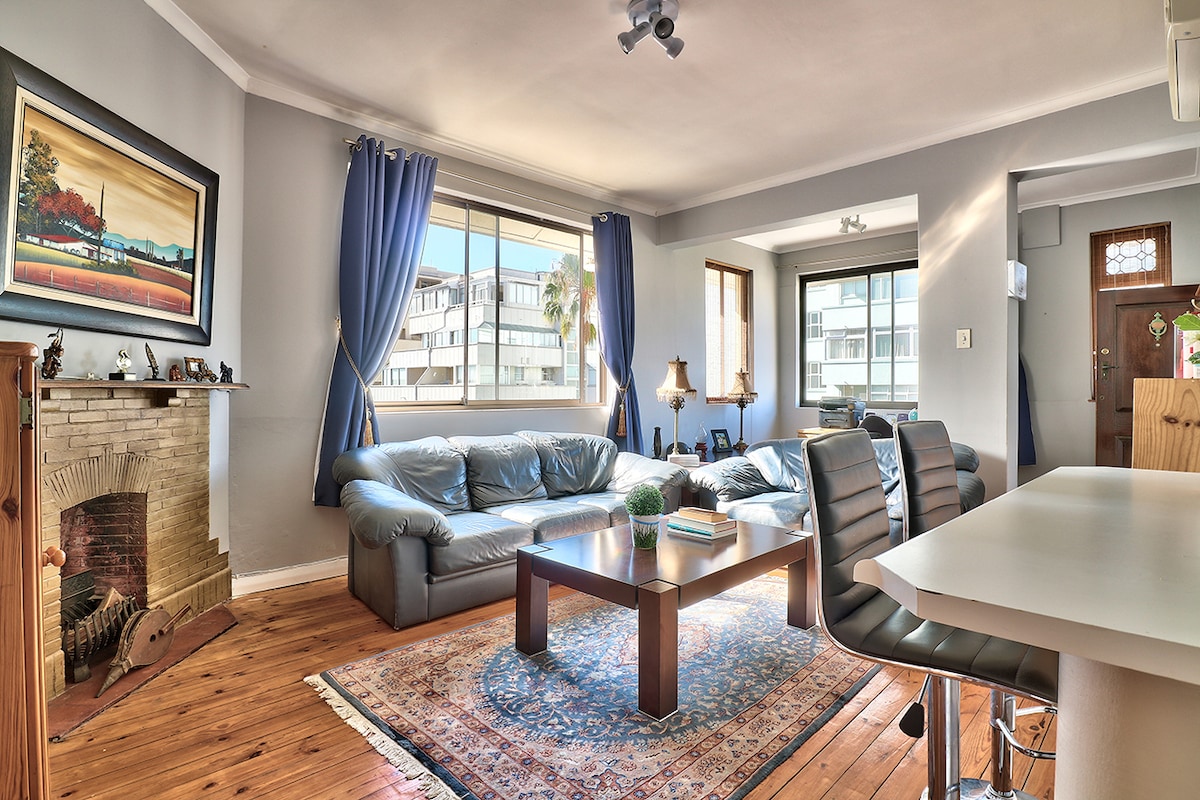 The apartment is large, sunny, surrounded by trees, has a big balcony with views of city and mountain. 1 double room. A comfortable home with couches, books, and fibre wifi. The kitchen has gas stove, fridge and washing machine. The location is suburban but close to town, a few blocks to bus stops, trendy restaurants, parks, coffee shops. Fireplace in winter and/ or gas heater for R20 extra per day. I live downstairs, but privacy is yours. If you are bringing pets please discuss before arrival.