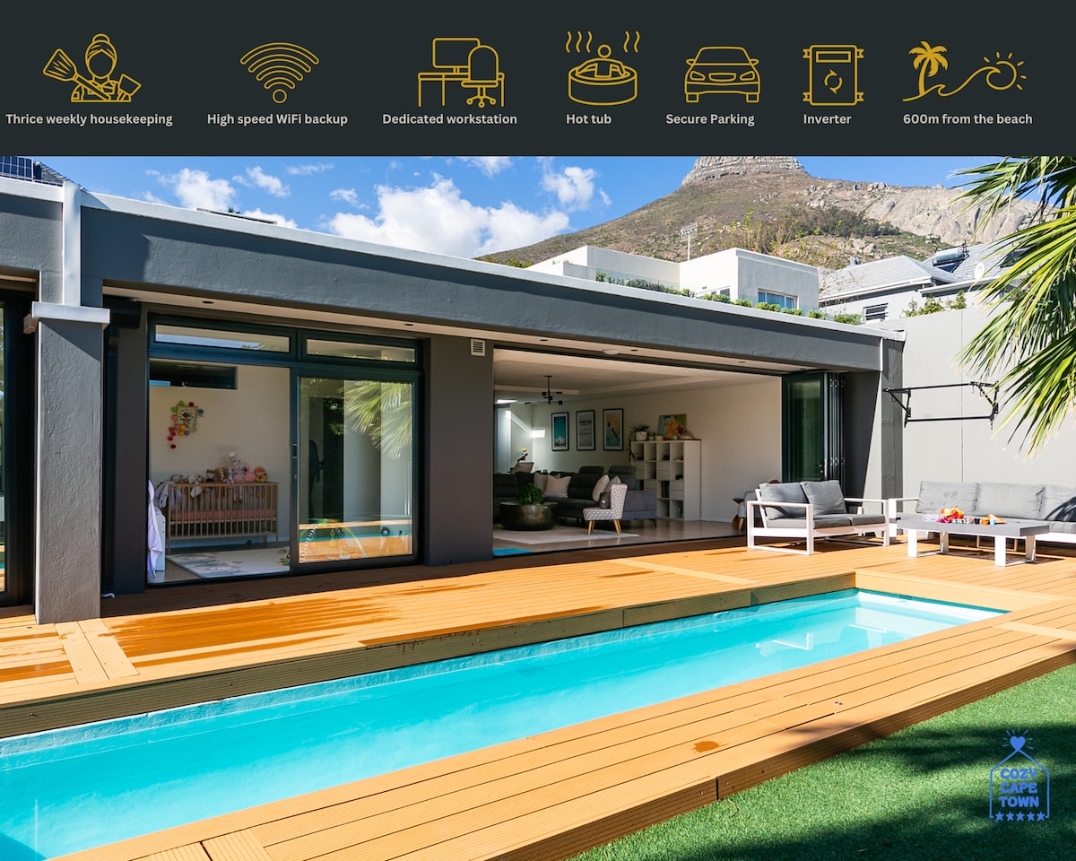 Come cool off in the sparkling pool of this three bedroom, modern chic contemporary villa. Centrally located in Cape Town City Bowl - Higgovale, situated on the slopes of Table Mountain. Clad almost entirely in timber and featuring floor-to-ceiling sliding doors, the indoor-outdoor experience of this home is exceptional. Free high speed fiber WiFi and secure parking for two cars. We have an inverter and Lithium battery to assist during loadshedding. A serene pad in the city. We Welcome you!