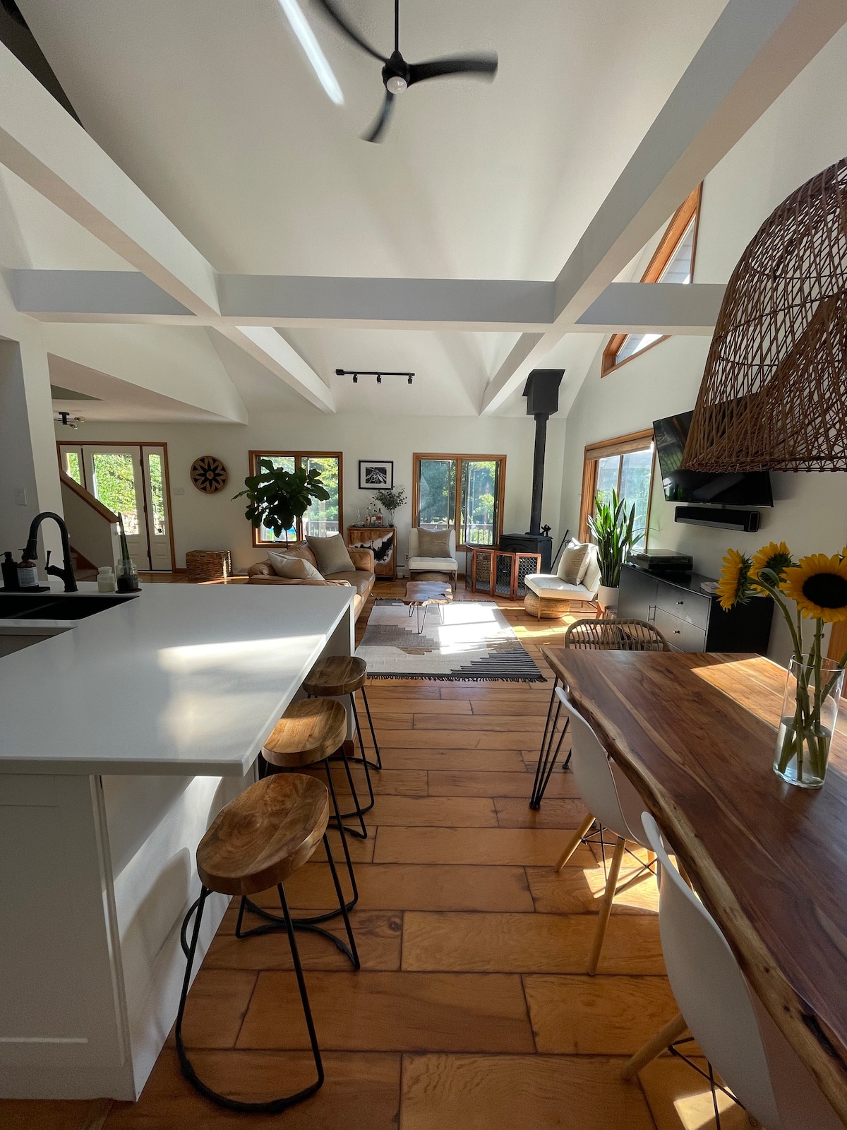 Escape to the country air at Sean & Brad's riverfront chalet on the Neversink River. Formerly a popular ski shop and yoga studio, this fully renovated property offers you every possible amenity. Walk across the street to launch your kayak or toss a line into some of the best trout fishing around, roast s'mores around the fire or visit the Resorts World Casino, just 5 minutes away. Golf, hiking, mountain biking, local breweries and distilleries...all just a short distance as well.