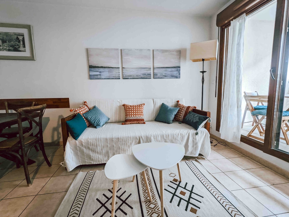 Appartement rénové de 50 m2 dans une résidence privée et sécurisée, à 300 m du centre. Il est composé d'une cuisine équipée ouverte sur le salon, d'une chambre avec un lit 160x200 cm, d'une salle de bain avec douche (serviettes de toilette et draps de douche fournis), d'un WC séparé et d'une grande terrasse. Toutes les fenêtres de l'appartement donnent sur le parc arboré de la résidence. Une piscine 12 x 6 m, un garage (l.240 x h.190 x p.500 cm) et un local à vélo seront à votre disposition.