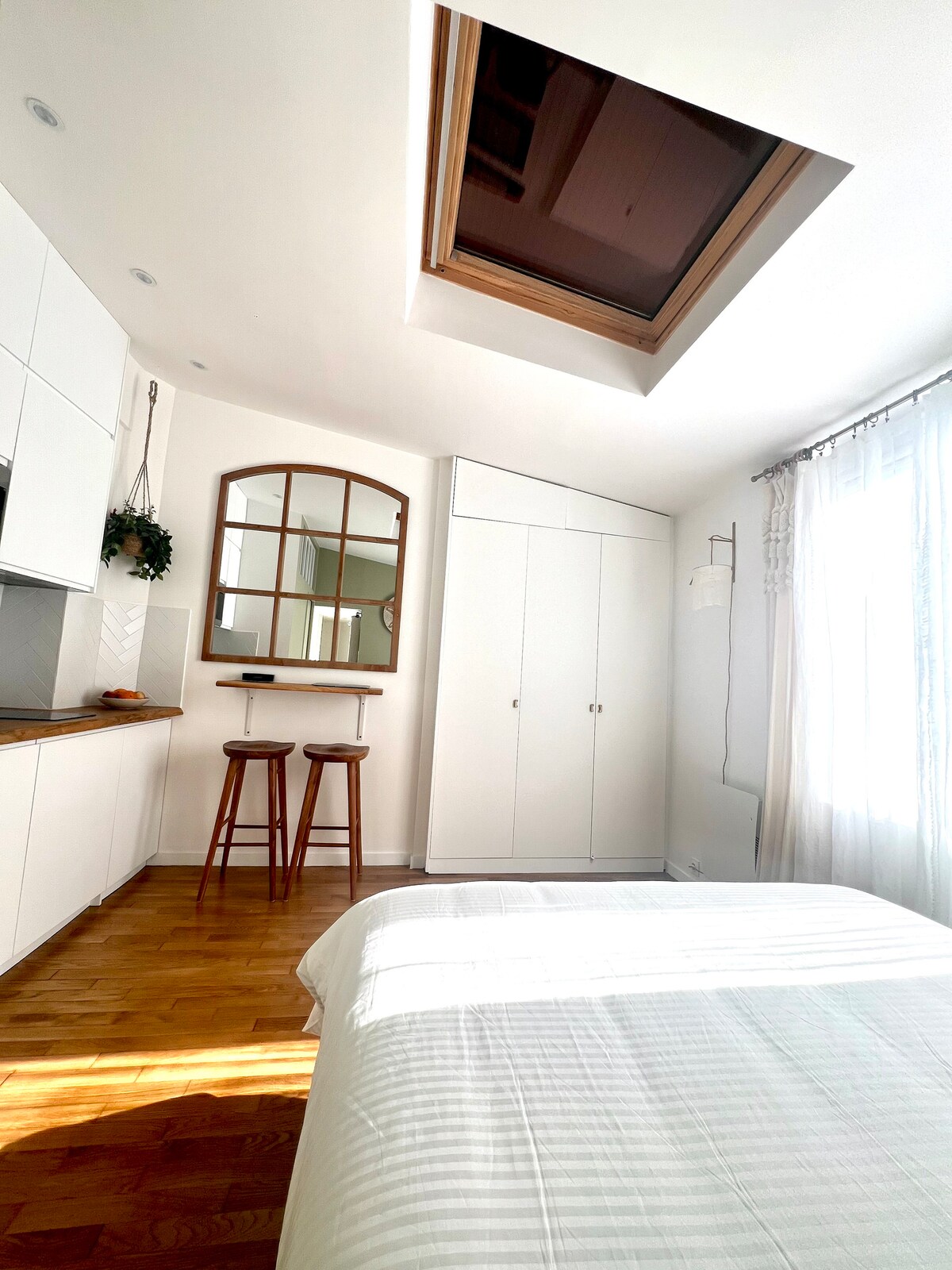 Ce studio est calme, lumineux et confortable. En plein cœur d’un quartier typiquement parisien très animé, vous dormirez dans un silence absolu et pourquoi pas avec vue sur les étoiles depuis le lit grâce à la fenêtre de toit. Le studio est au dernier étage d’un petit immeuble paisible de 3 étages sans ascenseur, le vis à vis est moindre ainsi vous pourrez voir les toits et les cheminées des immeubles voisins.