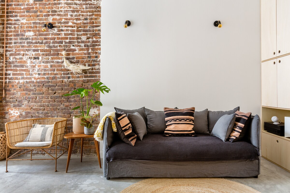 Loft au charme industriel, aménagé dans un ancien atelier, qui marie à merveille style brut et confort moderne. Profitez de sa belle hauteur sous plafond, de ses murs en briques apparentes, de son sol en béton et des éléments en bois qui apportent une touche chaleureuse à l’espace. L'accès au lit se fait par une échelle en bois, qui mène à la mezzanine. L'accès est difficile aux personnes à mobilité réduite et n'est pas adaptée pour les personnes en fauteuil.