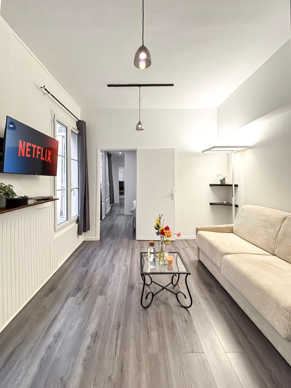 Welcome to our one-bedroom haven, meticulously designed with taste. Enjoy the calm of the courtyard and its small terrace, while in the middle of a lively district. The space emanates a warm, home-like essence. Situated in the heart of the trendy dining and café scene, on the banks of the canal Saint Martin, it's also a few blocks away from the historic charm of Le Marais district.