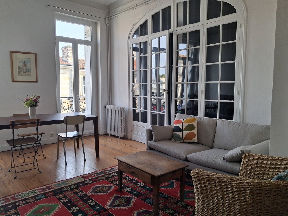 You are welcome in my beautiful 1 bedroom flat typically "Bordeaux style" with its limestone wall and its extravagant marble fireplace. Full of character, very clean, comfortable and light, it has the best location in the most charming part of the old city-center. Easy access by foot to all places in the city center. The apartment is on the 1st floor (without lift) of a 19th century building. There is a PUBLIC CAR PARK (NOT FREE) called "Camille Julian" at 20 m away from the building.