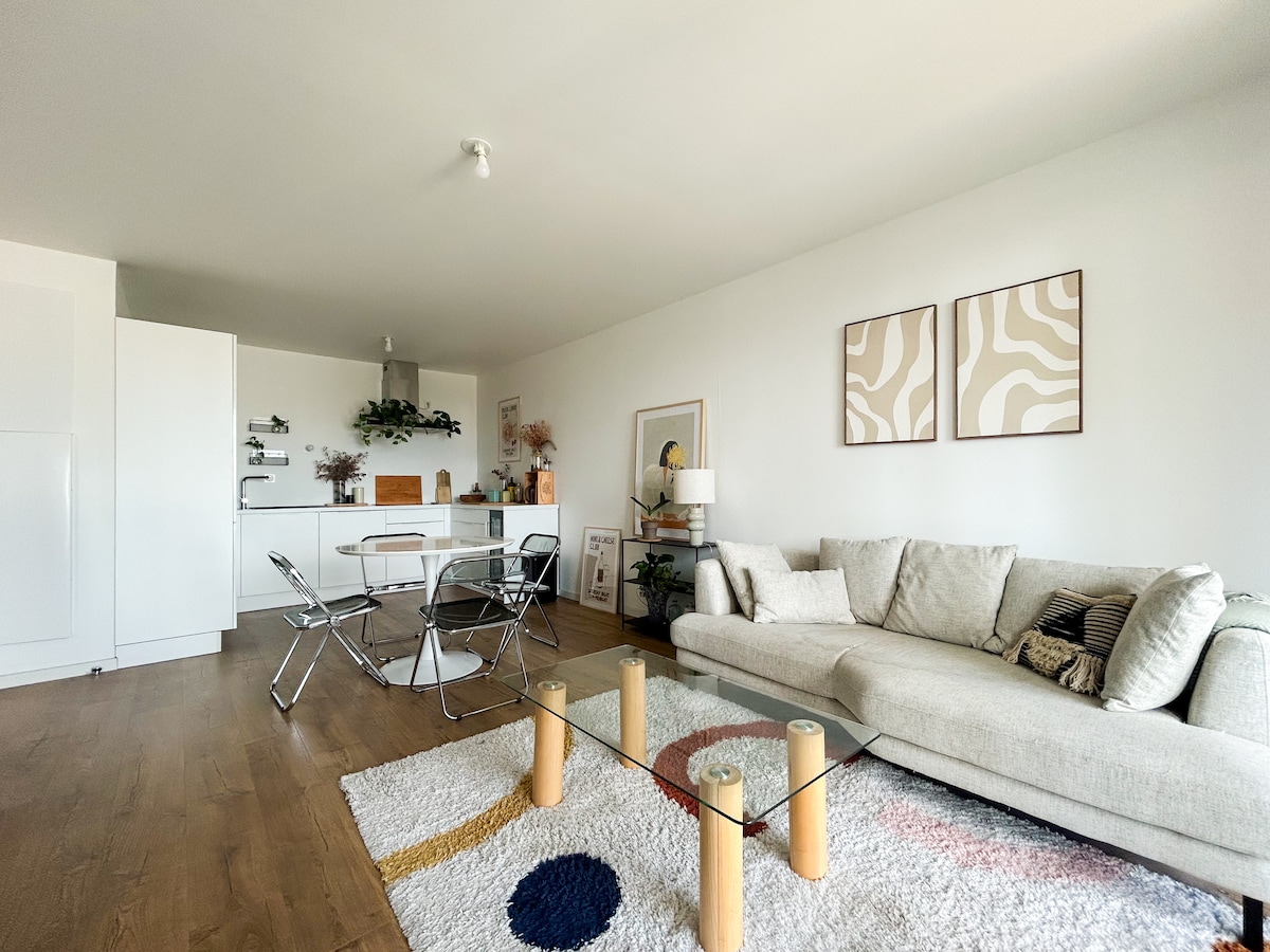 Profitez d'un séjour confortable et agréable dans cet appartement calme et sécurisé. Il est situé au 16ème étage d'un immeuble de prestige à Bordeaux. Il se compose de 2 grandes chambres. Balcon communicant et chacune sa salle d'eau. La cuisine toute équipée s'ouvre sur un espace de vie de 40m2, donnant sur la terrasse de 20m2 avec un panorama d'exception. L appt est situé à proximité du tram et commerces. Il peut accueillir 4 personnes et dispose de tout le confort nécessaire.