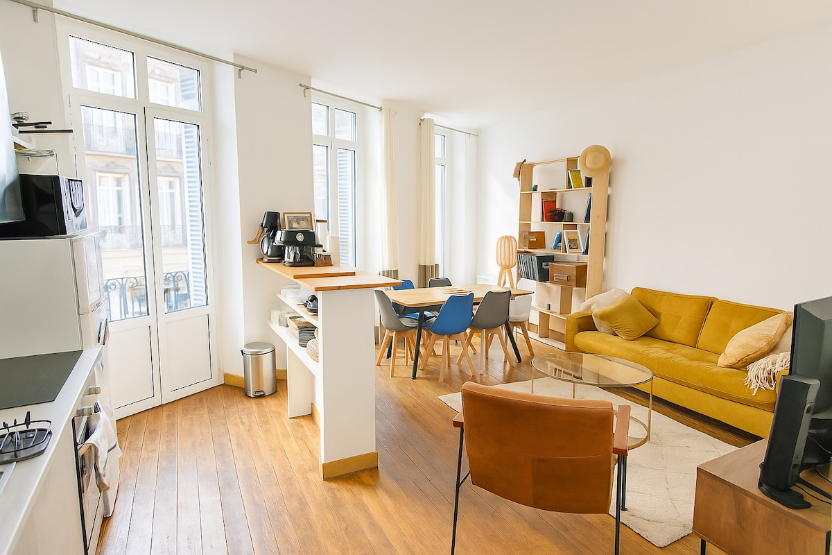 In the heart of Bordeaux this spacious T2 (52 m2) is the place to discover Bordeaux, its heritage and vibrant neighborhoods. In a beautiful building of the XVIIIeme you will find modern comfort with the charm of old buildings. Restaurants and pubs on site can be noisy despite double glazing. No late check in