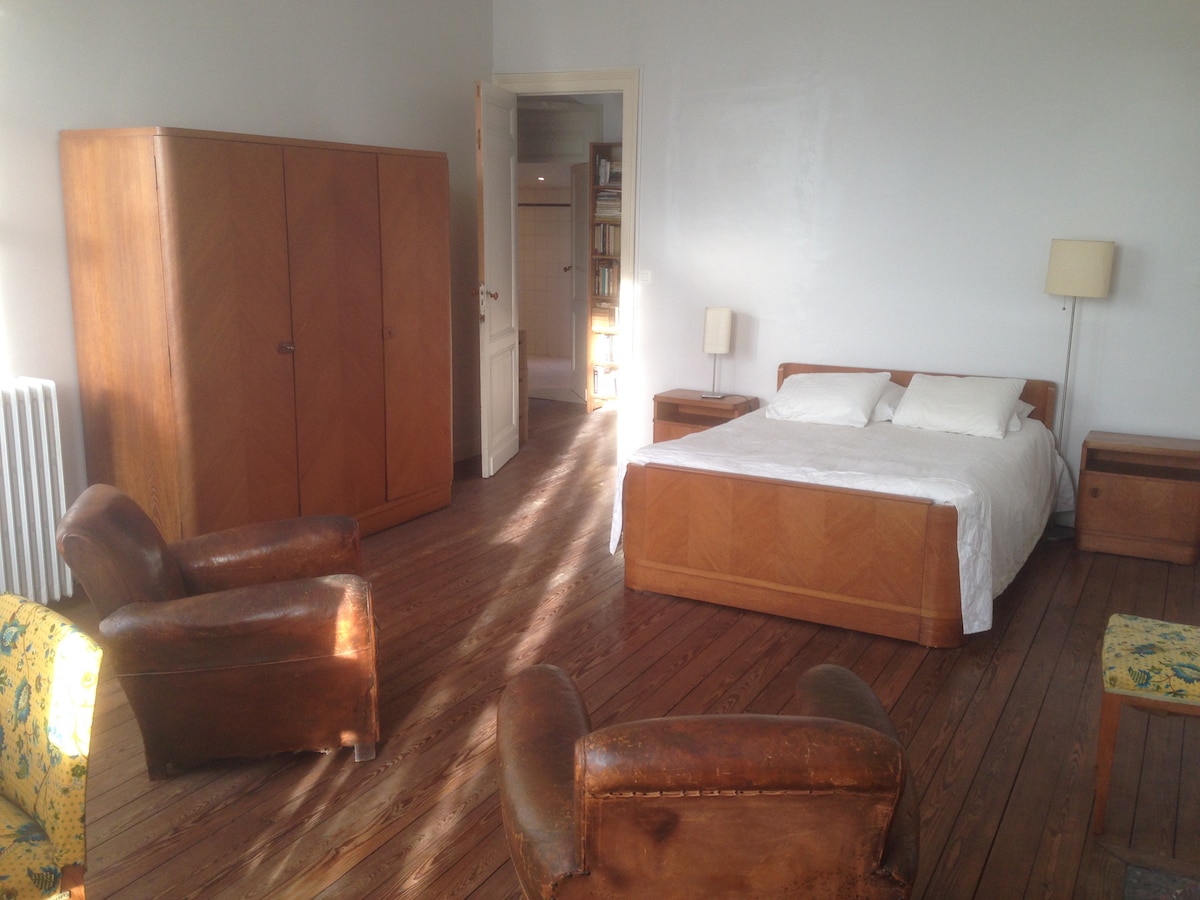 Warm and peaceful, this lovely bedroom is situated in our family stone building. The street is quiet, bright and close to all the conveniences (shops, transport...) and of the historic district. You'll take beautiful walks around...! The room looks out on the gardens. It has been decorated with care and love. Private shower-room with toilets FREE coffee, tea, biscuits and fridge in the room Shared fully equipped kitchen High speed Wifi ! Secured Parking in option
