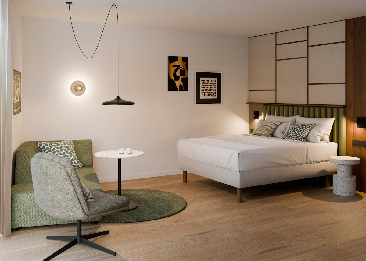 Sometimes great things come in small packages. Find functionality, unique design and most importantly, comfort in just 15m². Traveling alone or as a couple, wind down after an intense day of work or sightseeing in a queen size bed worthy of a 5-star hotel. Enjoy excellent wifi and a 49-inch TV with Chromecast or a luxurious and rejuvenating shower with a rain shower head in a private bathroom stocked with ecologically responsible products and a curiosity library.