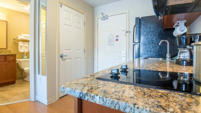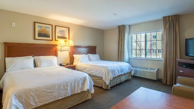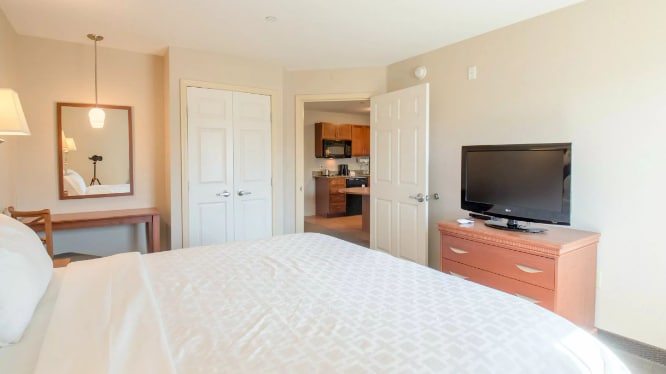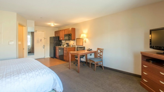 Perfect for groups or families of up to 4 people, the Double Queen studio suite is furnished with two queen beds, and a fully equipped kitchen with all of the conviences you need for a comfortable stay. The kitchen includes a full size fridge, stove, dishwasher, microwave, pots, pans, utensils and all of the kitchenware you need. The room also features a reclining chair to enjoy the HD TV, a work desk, and a private bathroom..