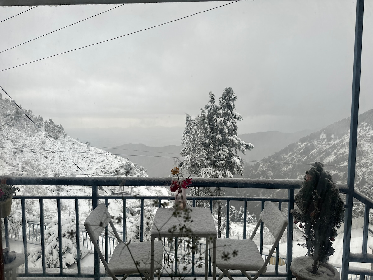 Enjoy a memorable visit when you stay in this unique place. Herne Lodge is a 200 years old estate, with a main colonial building and a newly renovated wing housing this apartment. The apartment commands a panoramic view of the inner Himalayan range, and overlooks the Yamuna-Aghlad river valley. The snow clad Bandar Poonchh range is also visible in the distance, behind well known peaks like the Nag Tibba. This kind of panoramic view is very rare in our region. Quiet Hours 10 PM - 9 AM. No pets.