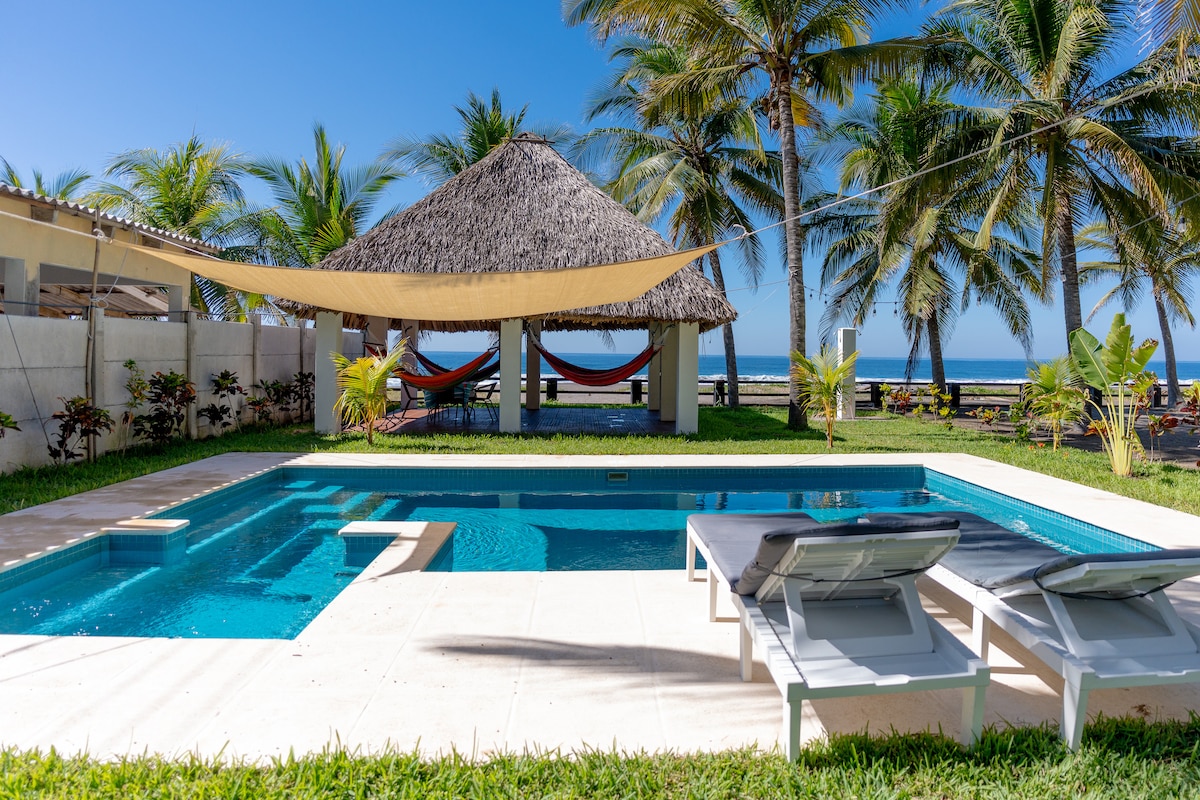 Recién construida, espectacular casa de playa frente al mar. Esta propiedad cuenta con casa principal con tres dormitorios con baño propio y aire acondicionado en cada habitación. El rancho social cuenta con baño, comedor principal, desayunador, y bar. Todo esto a unos pasos de una refrescante piscina de filtro. Los jardines son engramados y su verde espectacular contrasta con el azul del mar. La cocina esta completamente equipada con refrigerador, freezer, cocina y todos los utensilios.
