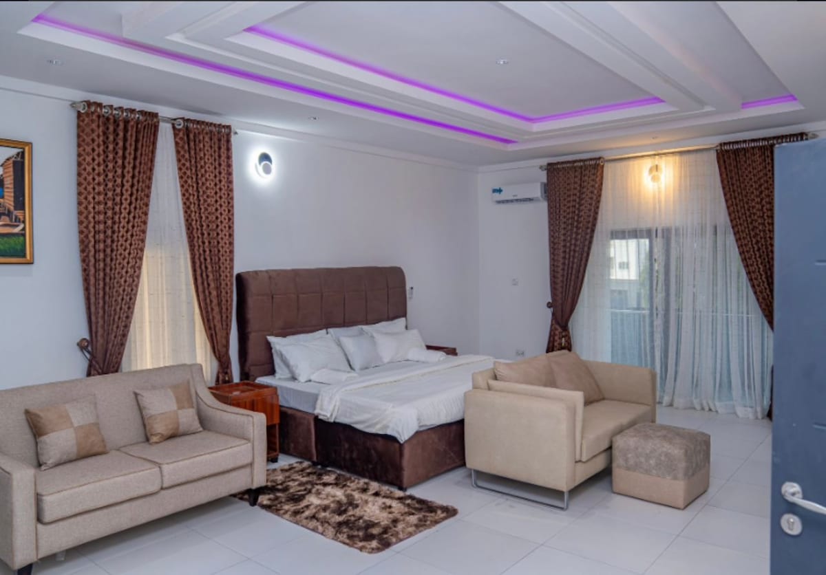 Royalty Luxury Serviced Apartment was concieved & designed as a home for Royals. It’s quiet, unique, stylish & homely with exquisite furnishing to give a feel of a comfy home. Located in a serene secured gated estate and offers convenient access to all part of Abuja and it's environs. 247 electricity with solar/Inverter systems, Fiber Optic wifi, fan, fully fitted modern kitchen, armed security, quiet neighborhood. Standard pool table, relaxation swing, private swimming pool & washing machine.