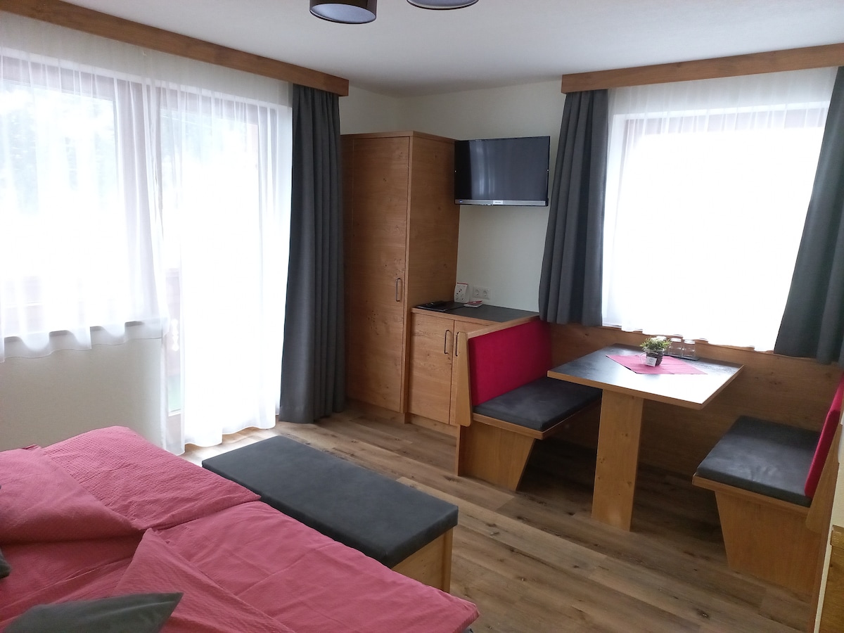 Unser Balkonzimmer mit eigener Dusche/WC hat eine Größe von 27 qm. Das Schlaf-Wohnzimmer ist ein Raum. Es befindet sich im zweiten Stock mit herrlichem Gebirgsblick. In unserer sep. Bauernstube können sie ihr Frühstück genießen (Foto Essbereich) - gehört nicht zum Appartement! Ist aber im gleichen Haus. Natürlich ist das Appartement absperrbar. ANREISE SA oder So. Kurtaxe bitte vor Ort bezahlen. Pro Person pro Tag 2,80 € Mindestbuchung 6 Tage Von Mai bis September Mindestbuchung 7 Tage