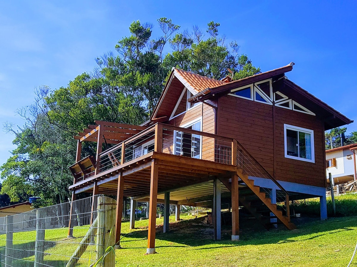 Chalé em madeira, com uma cama de casal no mezanino e uma bicama no estar com dois colchões de solteiro, cozinha completa, banheiro, estar, varanda em L com rede e churrasqueira, ar condicionado 22K, Wifi 60MB com fibra óptica, tv 32 smart , microondas, sanduícheira, liquidificador, cafeteira elétrica, garagem e uma ampla vista para o mar e para a serra.