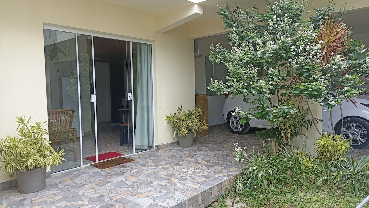 FLAT 3, lindo - Acomoda até 4 pessoas. Possui um andar apenas com um ambiente, tipo studio, com quarto-sala e cozinha. Banheiro privativo. Uma varanda com Deck, jardim e churrasqueira integrados, de onde é possível ver o mar. Com 1 smart TV, wifi, ar condicionado. Acomoda de 2 a 4 pessoas, com uma cama de casal e duas auxiliares. O local é incrível, com redes pra descansar, localização espetacular. Relaxe com a família nesta acomodação tranquila e de frente para o mar.