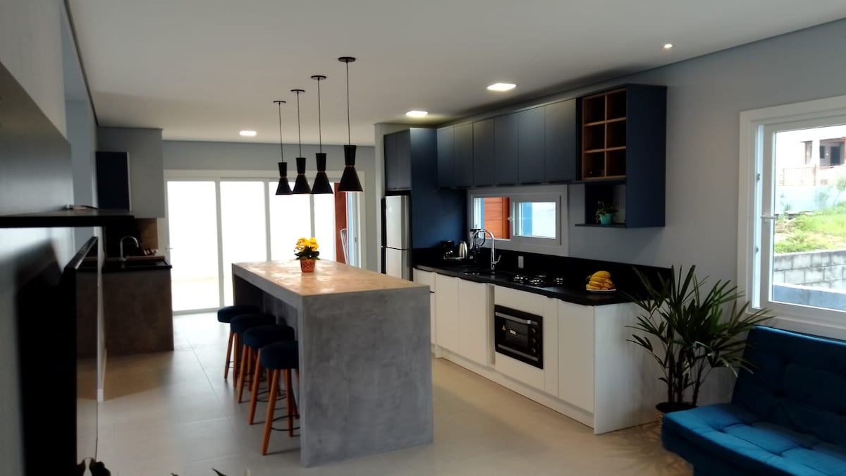 The house is new, modern, airy, bright, with lots of natural light and a beautiful heated overflow pool, great comfort for spending time on the beautiful Garopaba beach. All furniture, appliances and decoration are new, in the Jardim Panorânico neighborhood, on the coast of Praia do Silveira, 15 minutes walk from the central beach and also Praia do Silveira, and 5 minutes walk to downtown. Quiet neighborhood, perfect for those looking for rest an peace, and at the same time, near of everything.