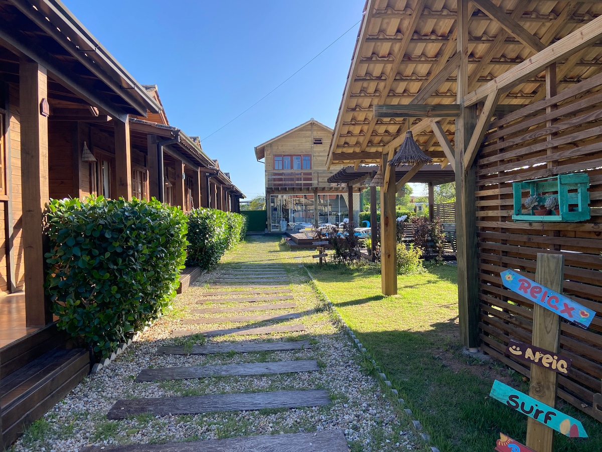 Cabaña completa perfeito para casáis y pessoas que gostam de ficar perto da praia para ir caminhando , surfar ou fazer trilhas , a casa e rhodiada do morros é muita natureza o son dos pássaros e o que mais prevalece no ambiente , e barrio é muito tranquilo , a cabana tem um jardín bem grande para los hóspedes, Wi-Fi fibra óptica .