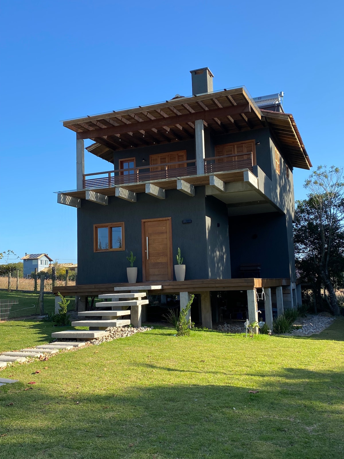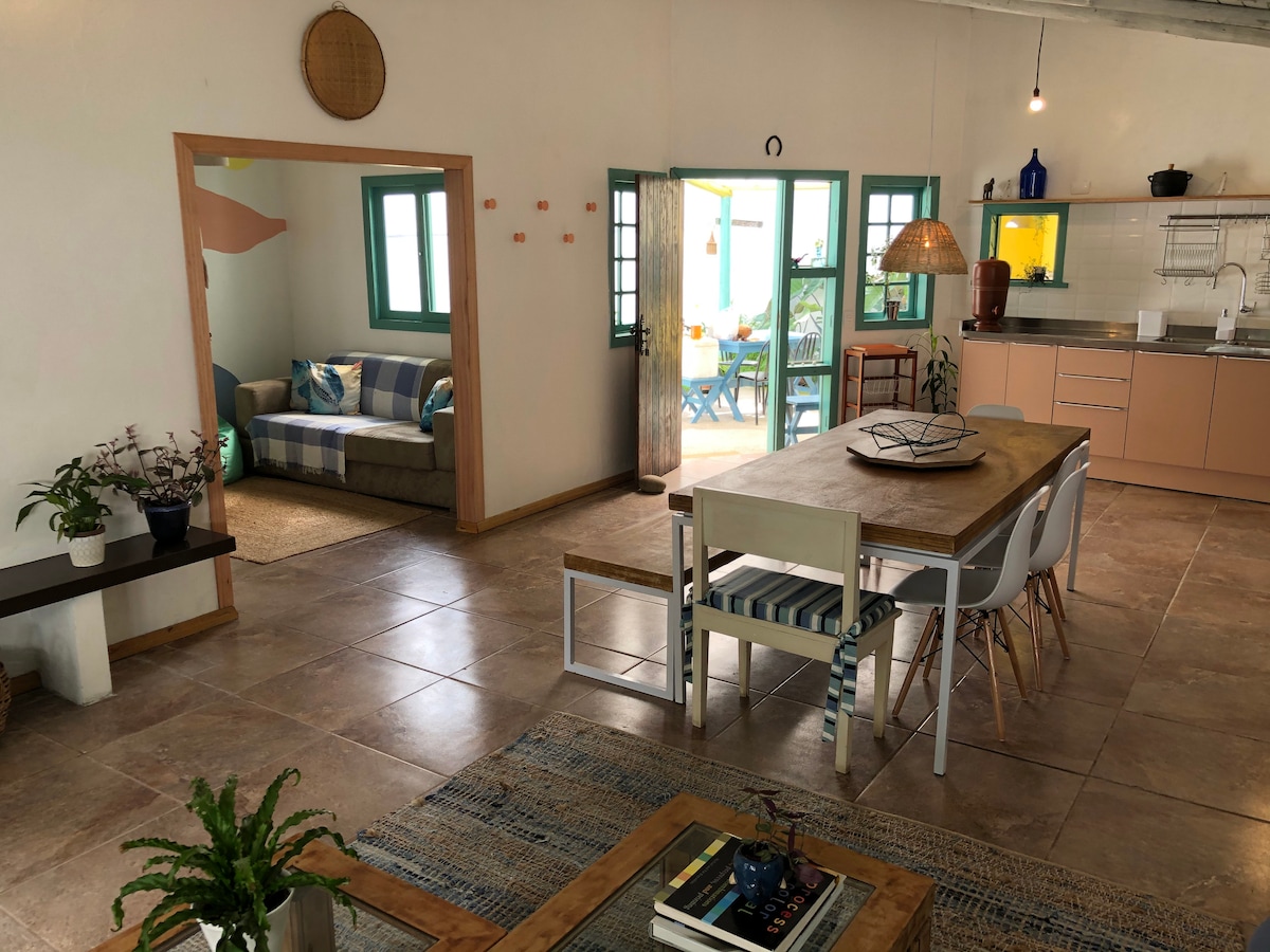 A casa é privativa e está a 1km da praia e a 20m da lagoa. No mesmo sítio, a 10m, terão duas cabanas com hóspedes e uma linda fauna. Vc pode encontrar cães e bois 🐂 A casa tem 2 quartos (1 deles com ar cond.) e 2 banheiros completos. - 2 sofás e um sofá cama de casal, uma cama extra de solteiro e duas camas de casal no total - fogão a lenha, forno a lenha, fogão 5 bocas, geladeira. Comodidades adicionais: - Tv 42” - Wi-Fi - 4 caiaques (uso compartilhado) - Rampa para barcos