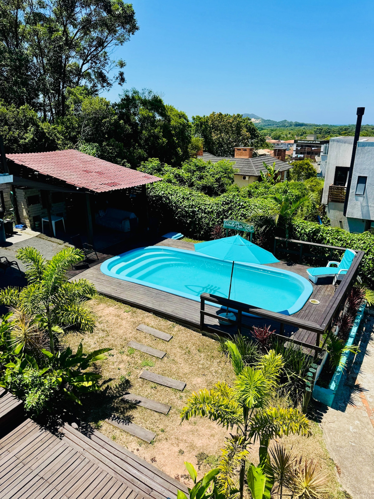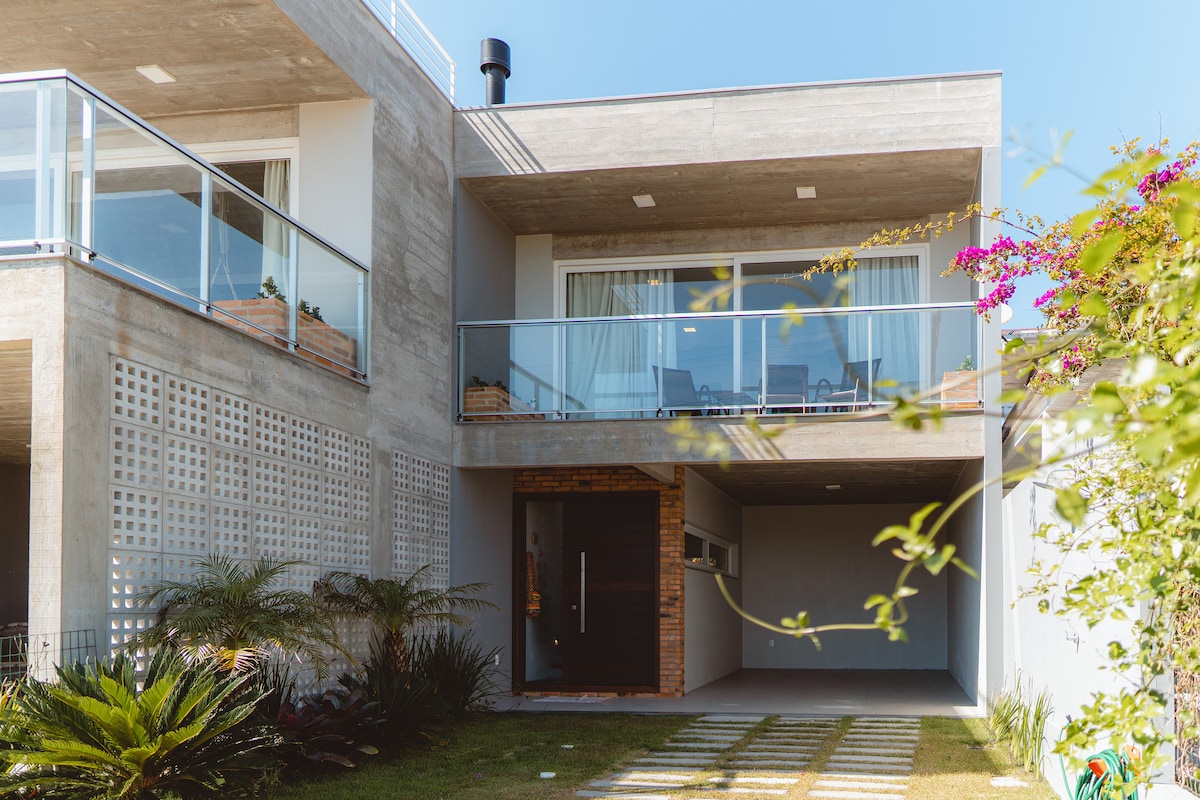 The most private+scenic view on quiet south Florianopolis, new in the market and ready for reservations. Large house with gorgeous view to beach and swimming pool. Nice extensive deck, 4 bedrooms (two on top and two below, all with nice sea views), comfortable and stunning romantic views. 3 to 4 internal parking spaces. Our place is in front of the beach, perfect for couples, solo adventurers, business travellers, families (with kids), and big groups.