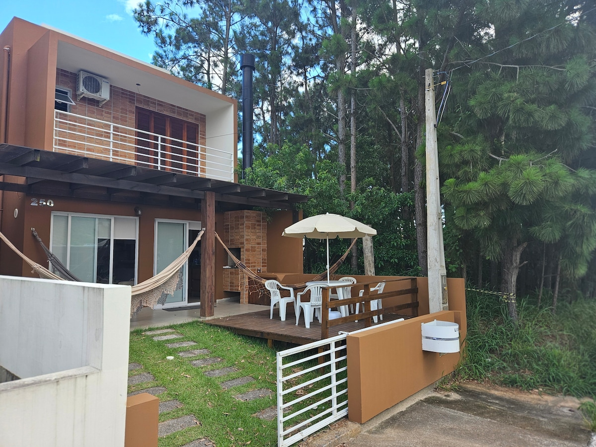 Aconchegante casa familiar, ampla, bem iluminada, toda cercada. Pátio grande com churrasqueira, bastante privacidade e protegido do vento. Situada em rua tranquila na Ferrugem, a 300 metros da praia. Sala integrada com a cozinha, sala de tv, uma suíte, um quarto de casal, um quarto com beliche, um banheiro, um lavabo e área de serviço com máquina de lavar roupas. Recém reformada e bem decorada. Com Wi-Fi, smartv, espaço para dois carros estacionados